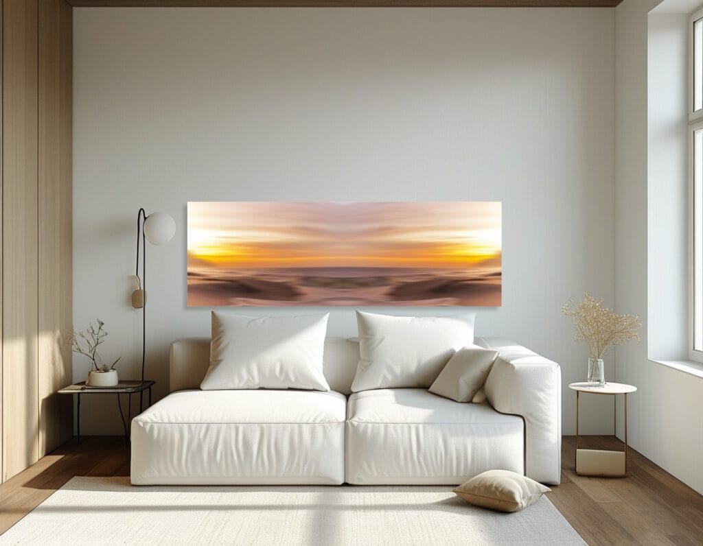 Uma fotografia em grande escala transforma a atmosfera da casa. Amplia o espaço, organiza o olhar e cria um ponto de contemplação que convida à pausa.