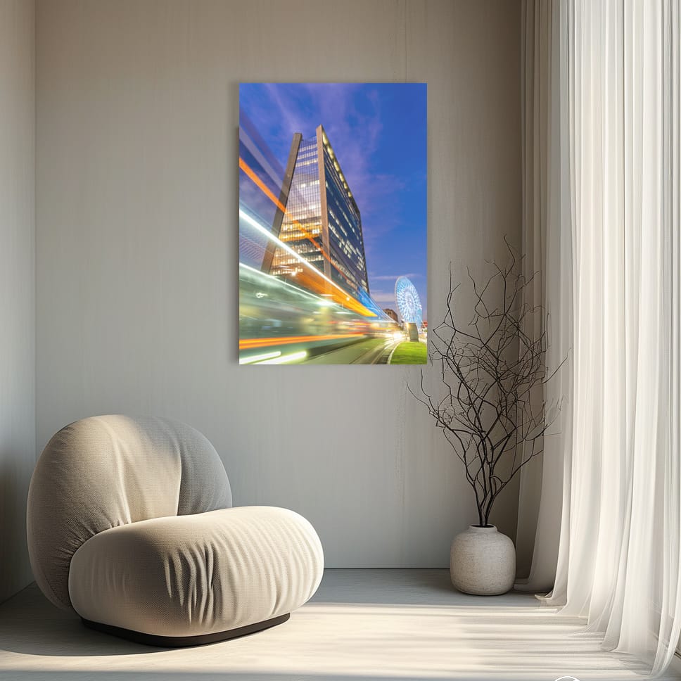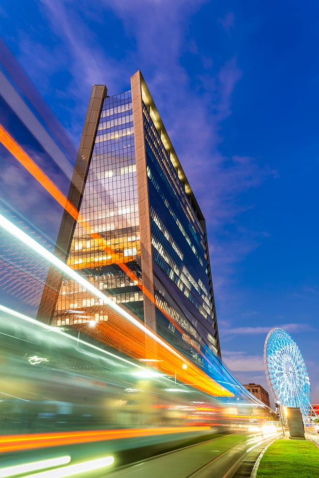Uma das faces laterais inclinadas da torre – com seus 90 m de altura e 21 andares cobertos integralmente com vidros refletivos – possibilitou capturar o reflexo do pôr do sol, o que conferiu um efeito chamativo à edificação. Enquanto o céu mantinha seu brilho residual, esperei que o brinquedo gigante, girando ao fundo, começasse seu show de luzes, que o terraço do moderníssimo arranha-céu se acendesse e que o trem cruzasse a frente da câmera. Com a longa exposição, consegui registrar um extraordinário efeito de luz e uma profusão de cores que reforçam o caráter modernista da cena e que podem levar o observador a demorar um pouco para examinar, em detalhes, a atraente composição.