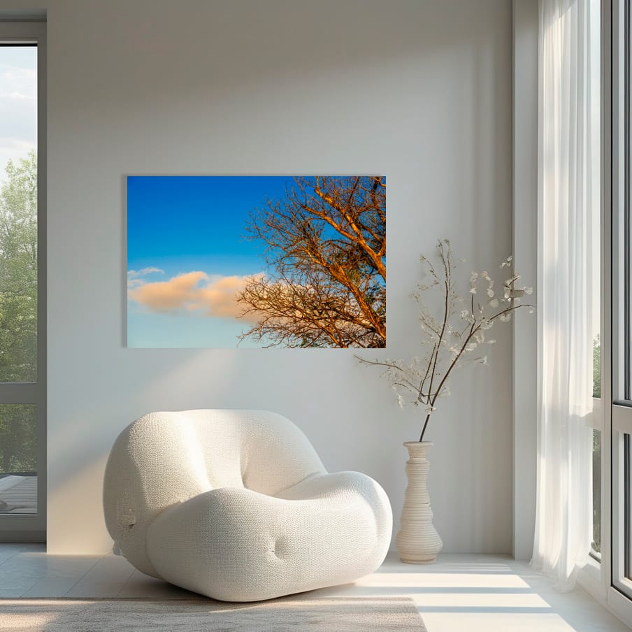 Durante algum tempo, fitei esta cena com entusiasmo. A luz suave e dourada que se reflete nos galhos secos e retorcidos contra o céu azul sugere um dia fresco de inverno, aquecido por um calor tênue. Generosas, e de maneira sóbria e elegante, as nuvens acomodam-se no terço inferior da imagem, proporcionando-me um resultado visualmente agradável para esta trama compositiva.