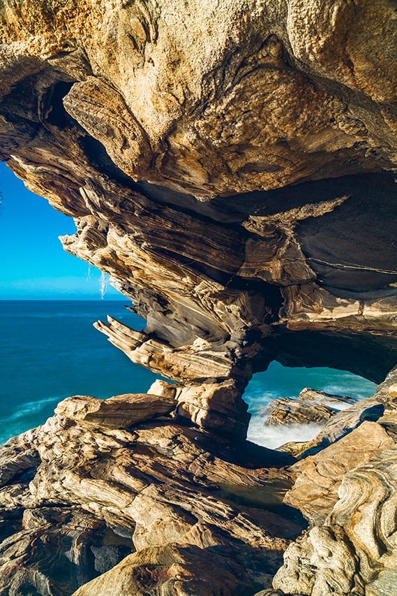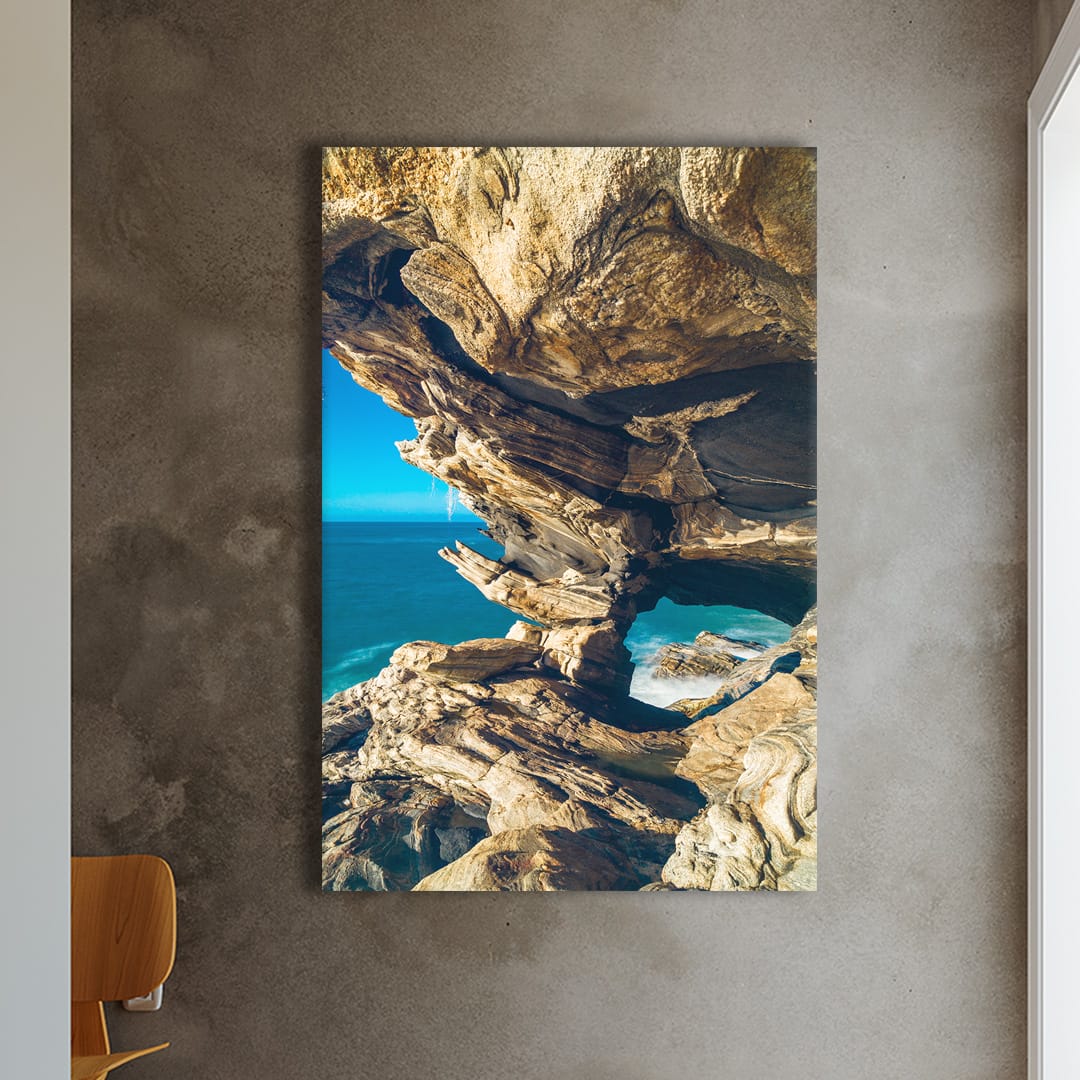 Deixe-se envolver pela harmonia única entre o mar sereno, o céu infinito e a deslumbrante escultura de pedra à beira-mar. Nesta composição fortemente aproximada, a imponente formação rochosa é banhada por uma luminosidade vibrante dos raios do sol da manhã, que evidencia seus detalhes com clareza e faz pulsar a cena. O arranjo pétreo é uma verdadeira obra-prima geológica, capturado em toda a sua riqueza.