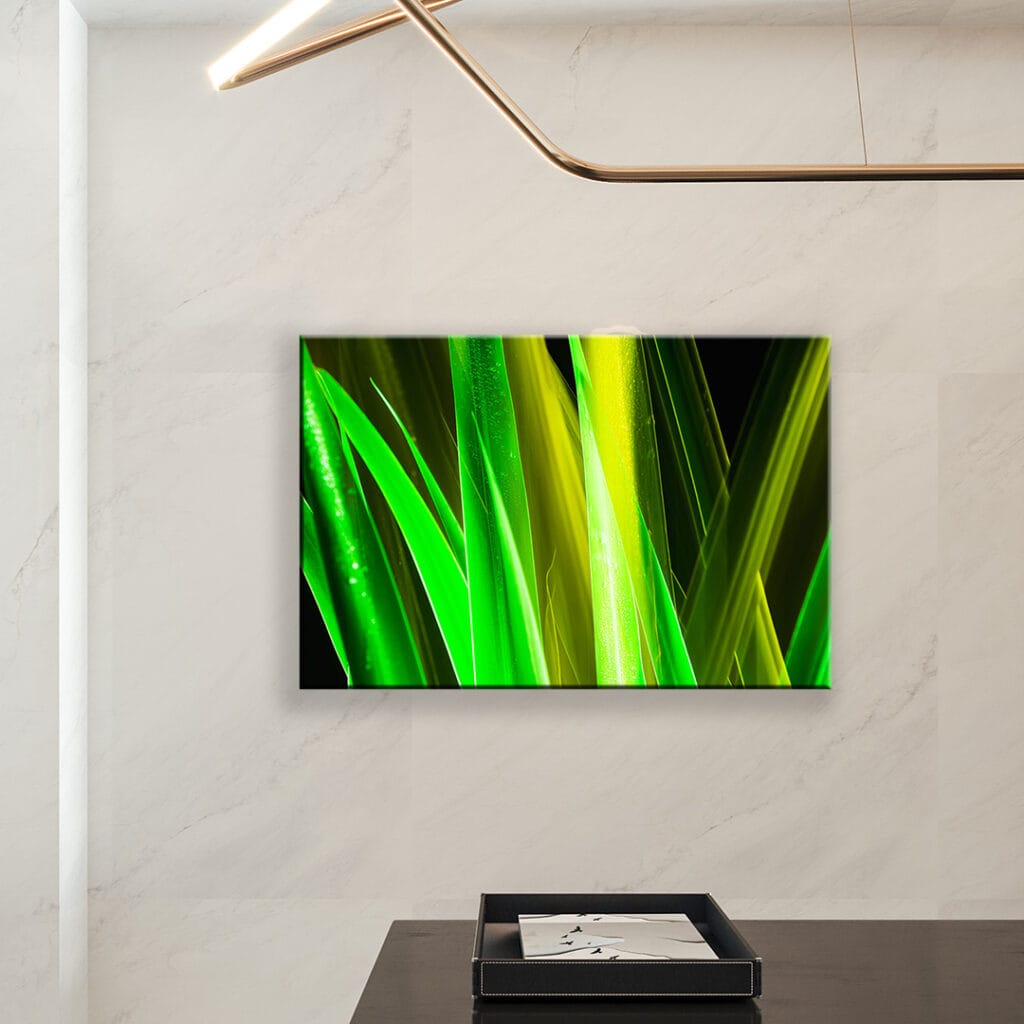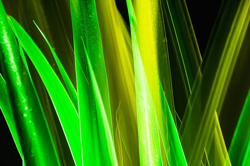 O aplicado conjunto de folhas do fórmio emerge de um fundo negro e ganha um precioso destaque com a luz. Com a câmera no tripé, fiz um ligeiro movimento no sentido vertical durante a exposição, o que gerou um atraente efeito tridimensional nas folhas de um verde aceso e vivo.