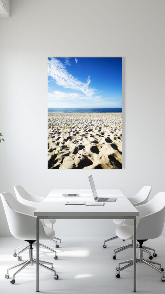 As primeiras horas da manhã são agradáveis e inspiradoras. Num registro clássico de céu, mar e areia eu elimino os excessos para obter essa composição minimalista. A luz natural projetada lateralmente promove uma interessante textura e relevo das pegadas na areia e conduzem o seu olhar para o restante da imagem.
