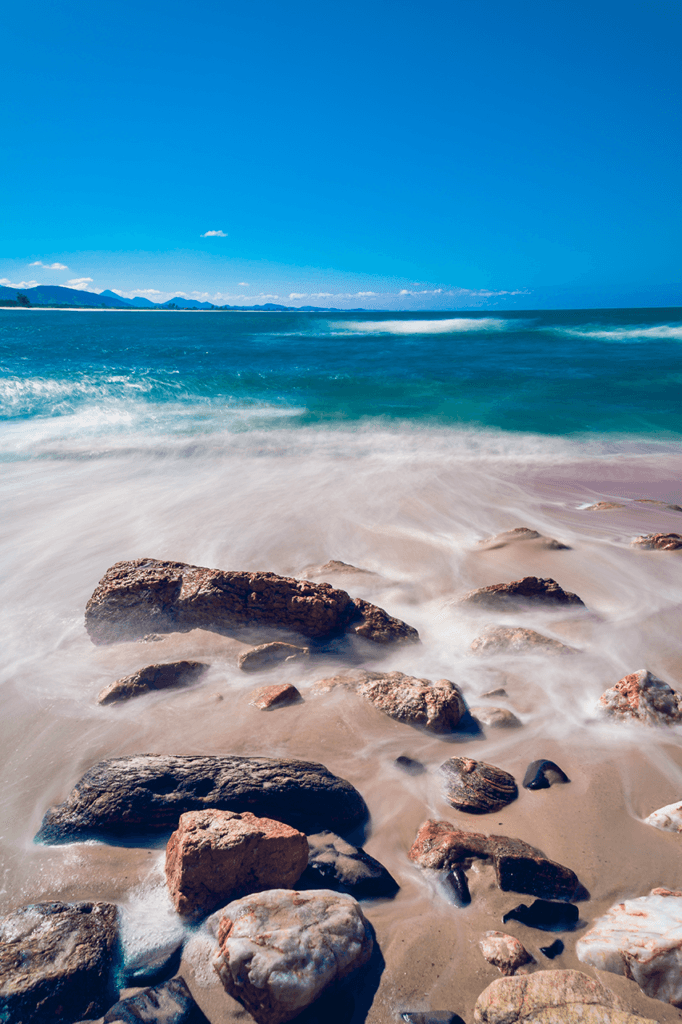 O registro através da longa exposição do vaivém das ondas sobre as pedras, gerou um atraente efeito de véu na fina areia da pequena e charmosa praia da Sacristia – Maricá – Rio de Janeiro – Brasil.